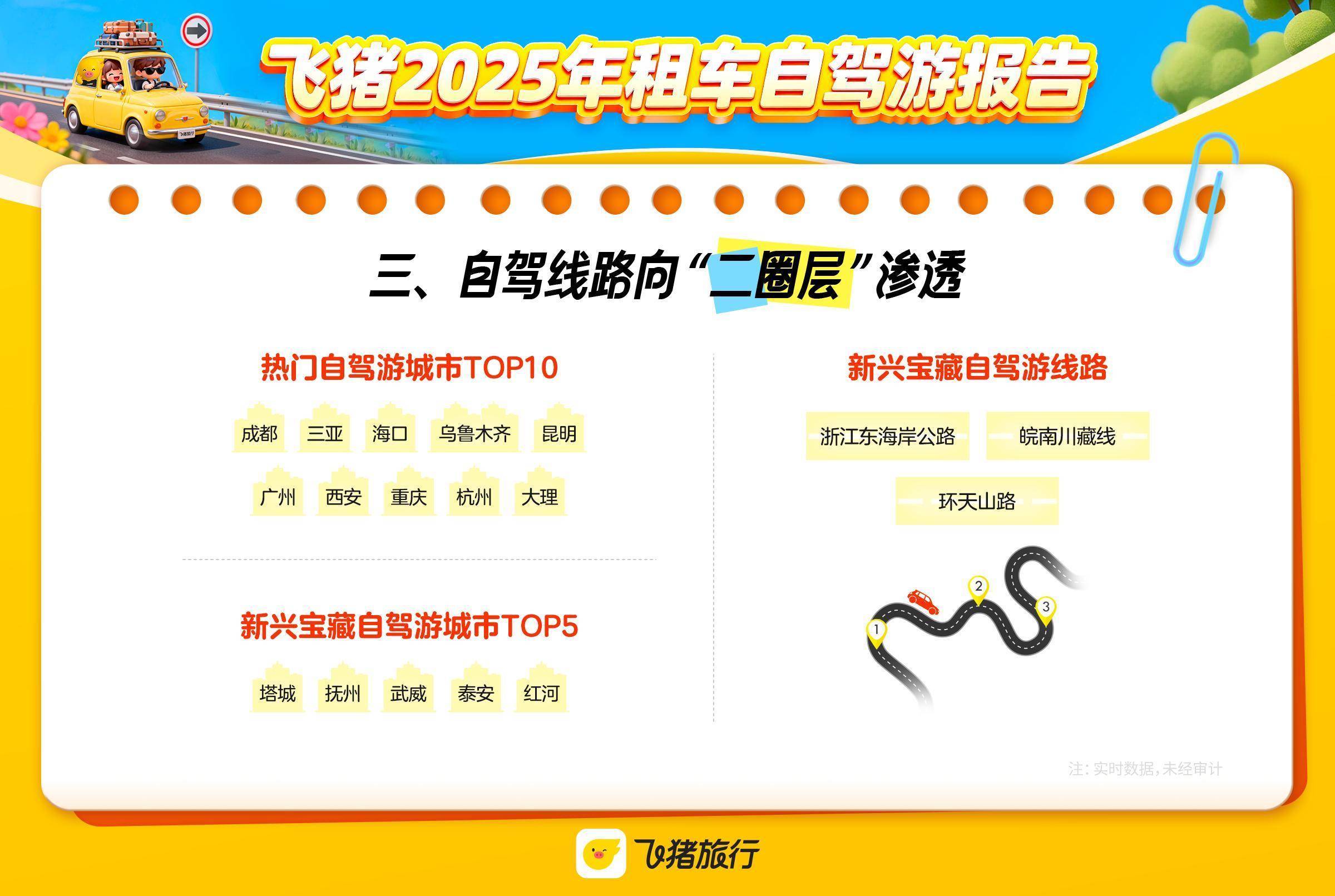 从趋势来看,自驾游正在从热点标的地的热点区域向相近的“二圈层”浸透,敷陈涌现,新疆塔城、江西抚州、甘肃武威、山东泰安、云南红河等地租车单量增速领跑寰球。纵不雅这些城市,均位于热点自驾区域但又并非传统的热点起讫点,景不雅独具特点且客流车流密度相对较低,是走走停停赏玩窗外江山的自然矿藏标的地。这也反应出自驾游正走向“标的地纵深”和“体验纵深”的形状。自驾游热点澄澈也反应出不异趋势,数据涌现,传统热点的北疆环线、青甘环线、昆大丽线除外,浙江东海岸公路、皖南川藏线、环天山路等成为新兴的自驾游热点区域。