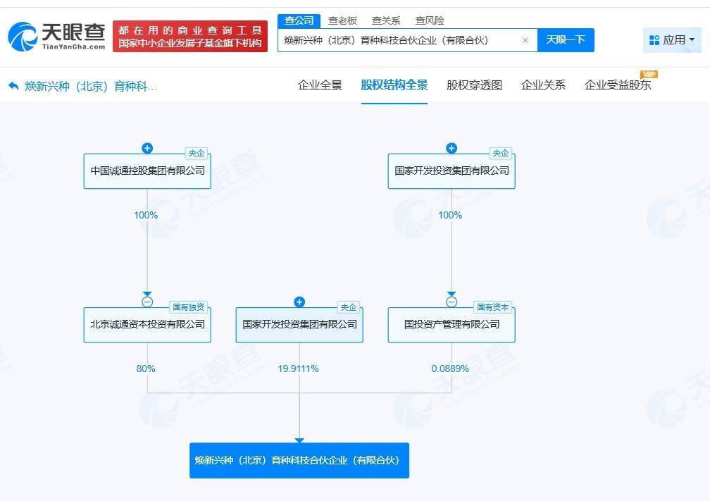 【大河财立方音讯】12月22日音讯,天眼查App败露,近日,焕新兴种(北京)育种科技合资企业(有限合资)建树,奉行事务合资东说念主为国投钞票科罚有限公司,出资额11.25亿东说念主民币,主义界限包括技艺事业、技艺开辟、技艺征询等。
