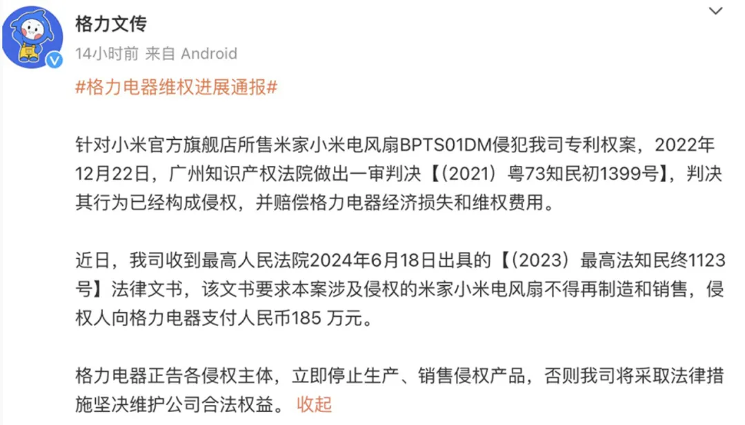 格力文传还称,针对小米官方旗舰店所售米家小米电电扇BPTS01DM滋扰格力电器专利权案,2022年12月22日,广州学问产权法院作念出一审判决【(2021)粤73知民初1399号】,判决其活动也曾组成侵权,并抵偿格力电器经济损构怨维权用度。