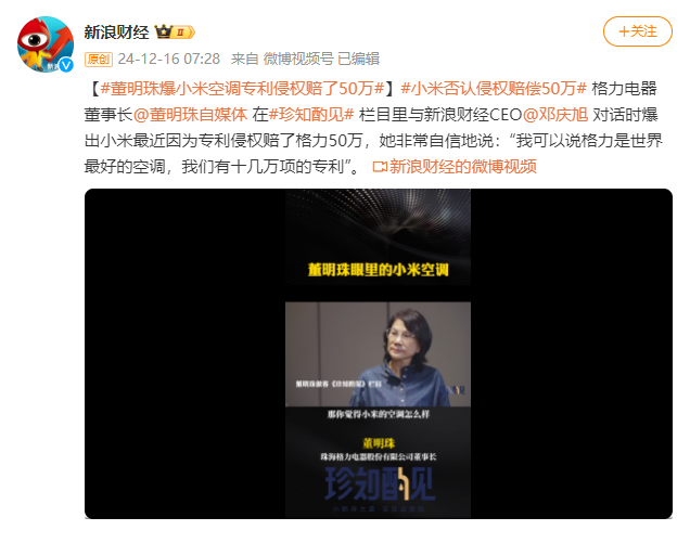 12月16日,据媒体报谈,格力电器董事长董明珠栏目里与新浪财经CEO邓庆旭对话时称,小米最近因为专利侵权赔了格力50万。她特殊自信地说:“我不错说格力是寰球最佳的空调,咱们有十几万项的专利”。