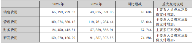 用度层面,公司握续加大技能插足,研发用度达1.59亿元,同比大增74.28%,主要系研发东谈主员薪酬及股份支付增多所致;销售用度、管制用度分别同比增长48.60%、58.04%,财务用度受汇率变动影响同比增长57.74%。