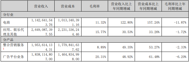 分产物来看,公司两大中枢业务慎重增长,整和谐销服求结束收入19.54亿元,同比增长49.35%,毛利率8.89%;告白平台业务收入18.38亿元,同比增长48.92%,毛利率20.31%,两大主商业务毛利率均同比下滑。