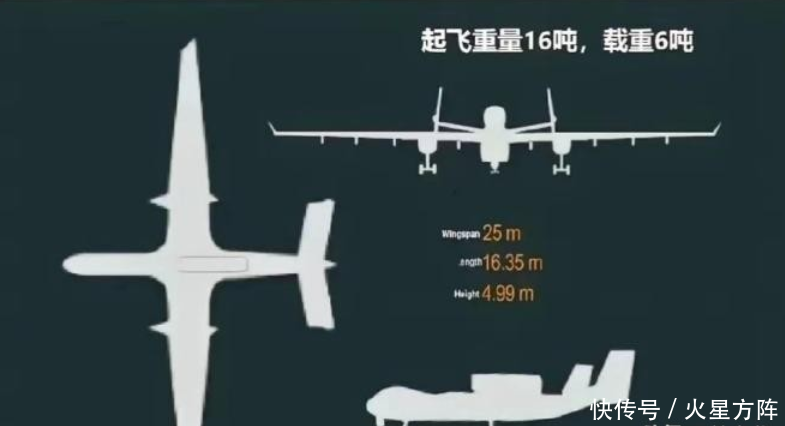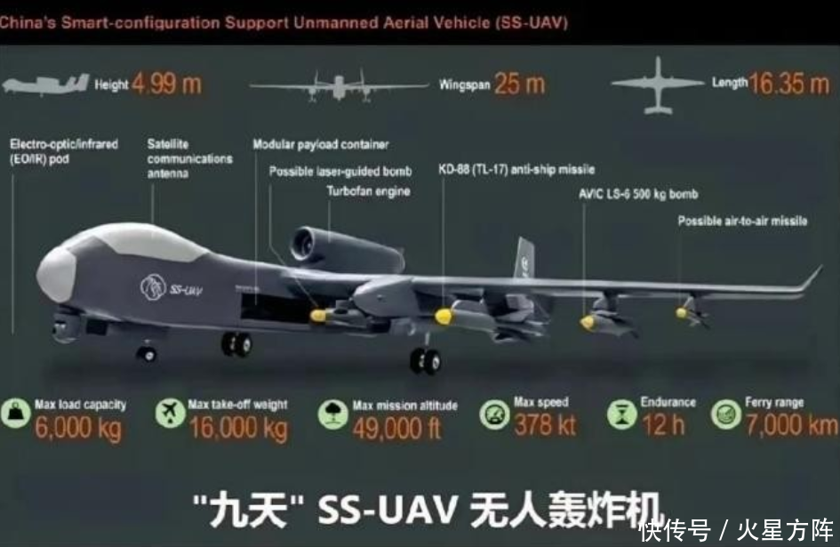 “九天”是一款可天真建树的重型无东谈主机,飞机翼展达25米、最大升空分量达16吨、最大载重6吨,既能当输送机、也能挂导弹、挂无东谈主机。