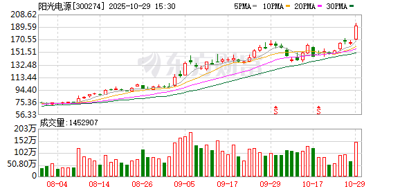 “光储一哥”阳光电源(300274.SZ)用两个月手艺完成了千亿市值的跃迁,从9月初初次涉及3000亿元市值到10月底摸高4000亿元。10月29日,公司股价在盘中片晌涉及市值4000亿元大关后,全天报收191.49元/股,总市值3970亿元,股价与成交额均创历史新高。